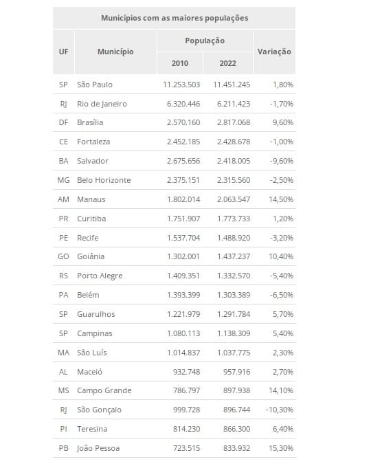 A capital federal é a terceira cidade do país com maior número de população, ficando abaixo de São Paulo e Rio de Janeiro. Veja os quadros com os dados por cidades e estados logo abaixo.